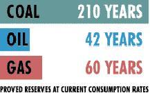 ” Although estimates of available reserves vary, at current annual rates of production about 155 years of coal, 40 years of oil, and 65 years of natural gas are left, worldwide (BP plc, Statistical Review of World Energy 2006). “ Source: World Resource Institute http://earthtrends.wri.org/updates/node/100